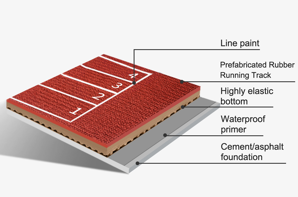 • Three-dimensional net-like internal structure: the track has excellent elasticity, strength, toughness and shock absorption effect, effectively reducing the athlete's muscle fatigue and micro-injury; the molded product is composed of upper and lower layers with concave and convex patterns.