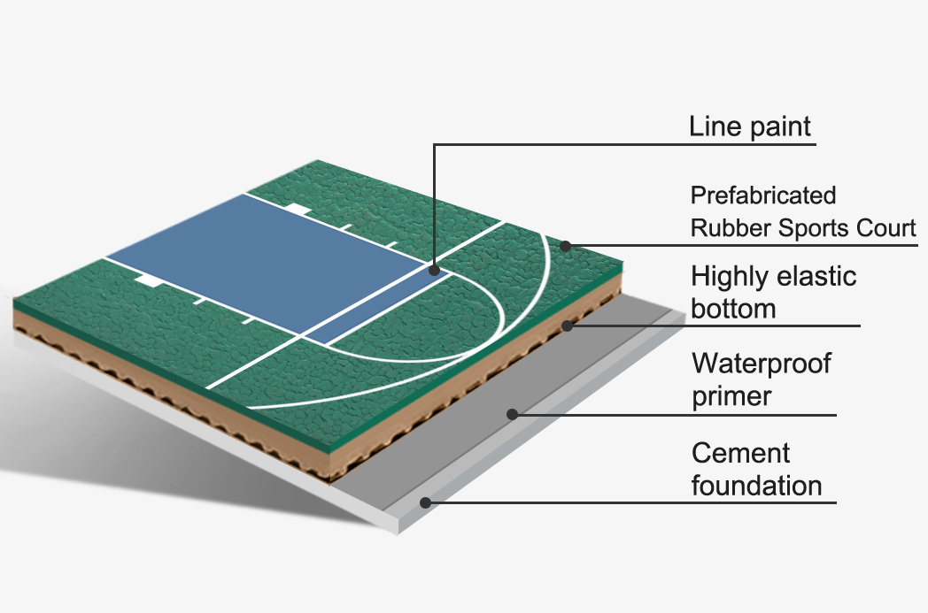 The Prefabricated Rubber Sports Court can be used indoors and outdoors. The sports surface layer adopts a high-density elastic wear-resistant layer, which is durable; the designed litchi pattern can meet the needs of different sports.
