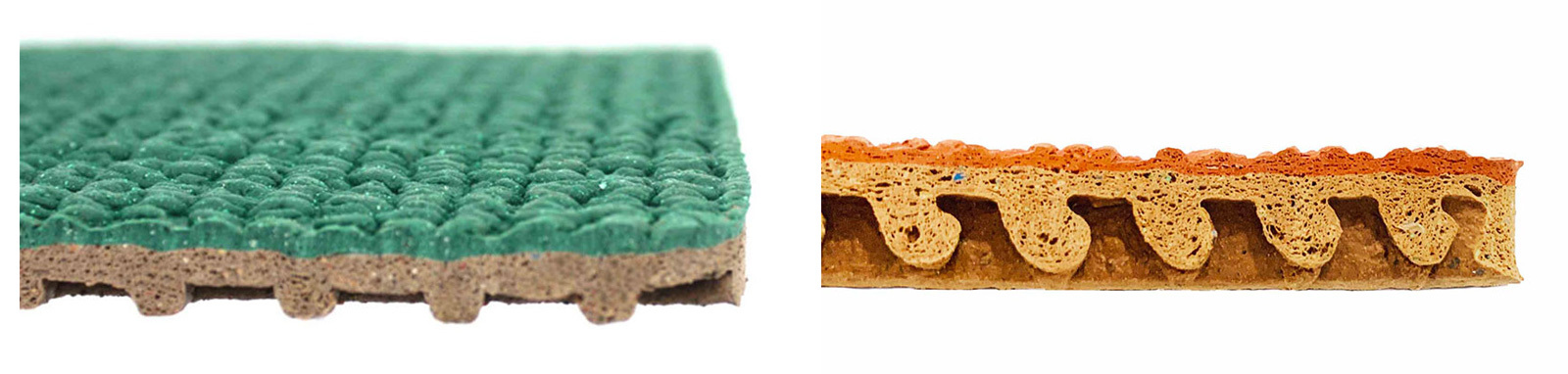 [The lower layer is colored composite elastic material], the bottom layer is designed with a concave-convex pattern, which maximizes the anchoring and compactness of the runway material and the base surface, and uses the rebound force generated by the air enclosed in the hole at the moment of impact to be transmitted to Athletes, thereby effectively reducing the impact they receive during exercise.